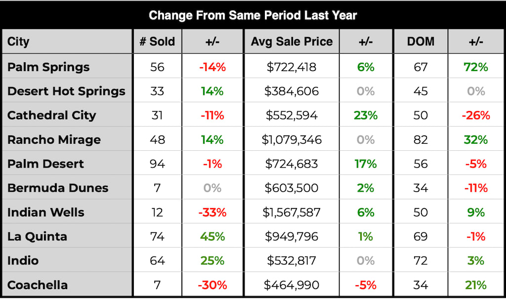 Sales volume decreased in most cities, with notable exceptions being Desert Hot Springs (+14%), Rancho Mirage (+14%), La Quinta (+45%), and Indio (+25%). The average sold price generally increased across the region, with Cathedral City registering a significant 23% rise. However, Coachella saw a 5% decrease, while Desert Hot Springs, Rancho Mirage, and Indio's average prices remained unchanged. The number of days homes spent on the market increased overall, except in Cathedral City (-26%), Palm Desert (-5%), Bermuda Dunes (-11%), and La Quinta (-1%).