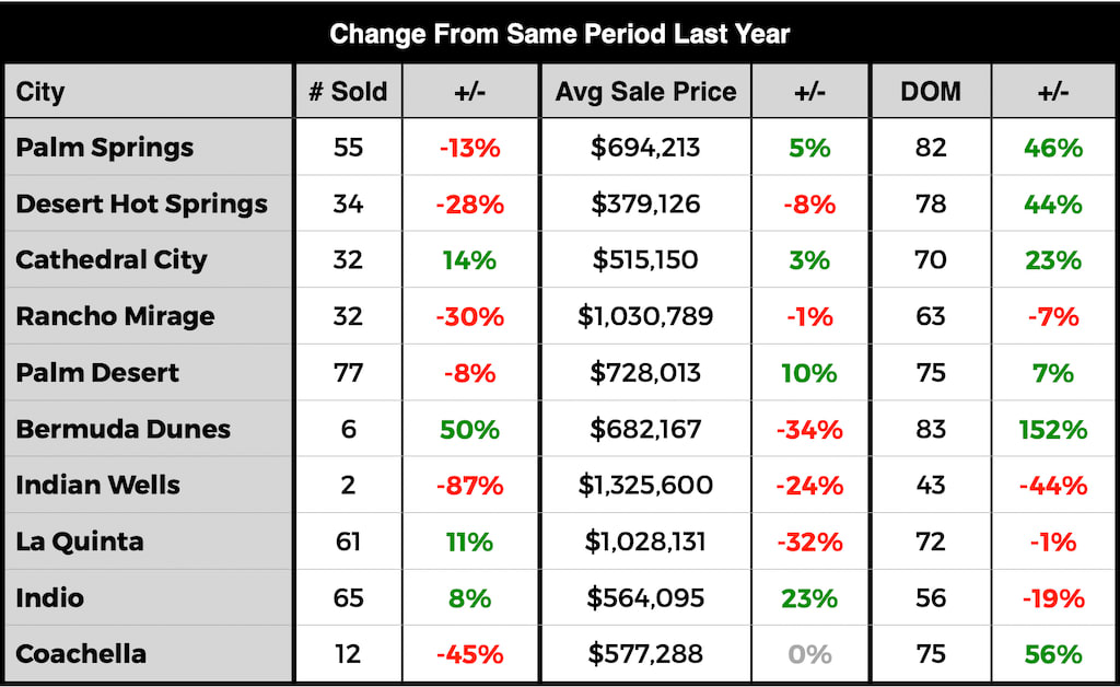 The Number of Days on the Market Increased for all cities in the Coachella Valley Except Rancho Mirage (-7%), Indian Wells (-44%), La Quinta (-1%), and Indio (-19%).