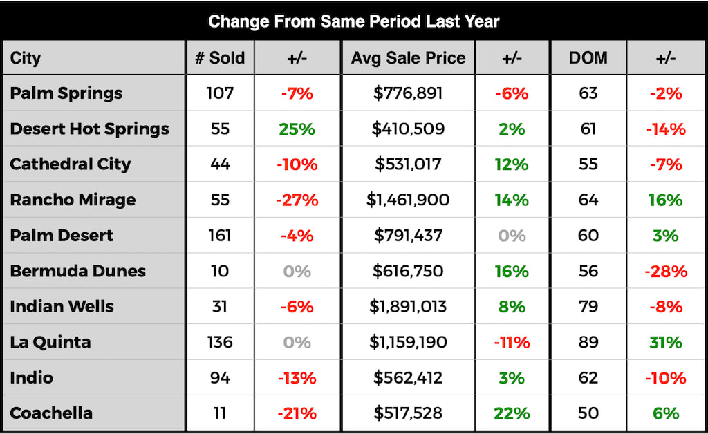 The Number of Days on the Market decreased for all cities in the Coachella Valley Except Rancho Mirage (+16%), Palm Desert (+3%), La Quinta (+31%), and Coachella (+6%).